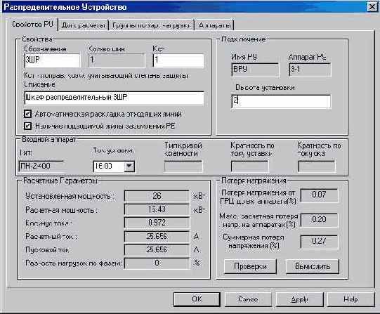 Окно свойств РУ «Распределительное устройство», также состоит из четырех вкладок «Свойства РУ», «Доп. расчеты», «Группы по характеру нагрузки», «Аппараты». Главная вкладка «Свойства РУ» содержит следующие секции для установки и отображения данных: «Свойства», «Подключение», «Входной аппарат», «Расчетные параметры» по мощностям, «Падение напряжения» на автоматах РУ.