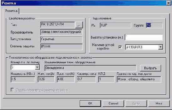 Страница свойств «розетка» позволяет отображать «Свойства розетки», «Подключение», параметры «Технологического оборудования подключенного к розетке».